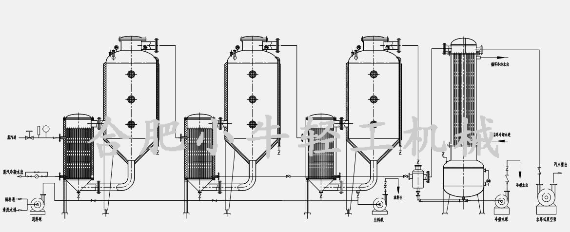 三效外循環(huán)蒸發(fā)器主要組成部件有第一效加熱器、第二效加熱器、第三效加熱器、第一效分離器、第二效分離器、第三效分離器、冷凝器、冷凝水罐、真空泵、料液泵、閥門管路系統(tǒng)、電控系統(tǒng)等。設(shè)備在運(yùn)行時,料液通過泵送或真空自吸原理進(jìn)入各效加熱器及各效分離器的管程,加熱介質(zhì)(鍋爐蒸汽)進(jìn)入第一效加熱器的殼程,料液在真空狀態(tài)下沸點(diǎn)降低,當(dāng)受熱到一定溫度后開始沸騰,并從噴射管噴入分離器,進(jìn)行快速蒸發(fā)和汽液分離,未被蒸發(fā)的料液從底部循環(huán)管回流到加熱器再次噴入分離器,形成循環(huán)。由一效加熱器產(chǎn)生的二次蒸汽進(jìn)入二效加熱器殼程,作為第二效加熱器的加熱介質(zhì),同理第二效的二次蒸汽作為第三效加熱器的加熱介質(zhì),熱能得到充分利用,從而實(shí)現(xiàn)節(jié)能效果。最后的蒸汽進(jìn)入冷凝器,被冷卻循環(huán)水換熱冷凝成液相,進(jìn)入冷凝水收集罐,最后排出。第二效、第三效的物料運(yùn)動狀態(tài)與第一效同理,當(dāng)料液縮到一定的程度,經(jīng)取樣確定合格后即可出料,完成蒸發(fā)濃縮過程。